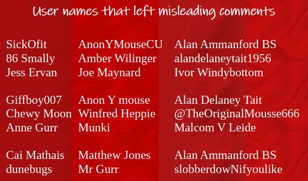 Some could be real names, but if they are, why do they make comments that they would have known to be untrue when they made them?