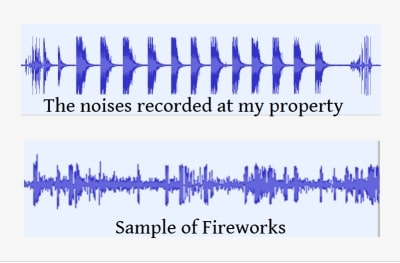 The picture compares the waveform of the noises recorded at my former property with a waveform of fireworks.